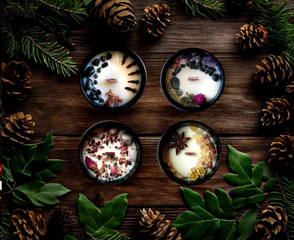 I blend unique scents from natural oils, botanicals, essences, enfleurages, and other earthly materials. Each candle is poured with intention, layering fragrance notes like spells, meant to conjure memories, awaken emotions, or simply evoke a little bit of magick.